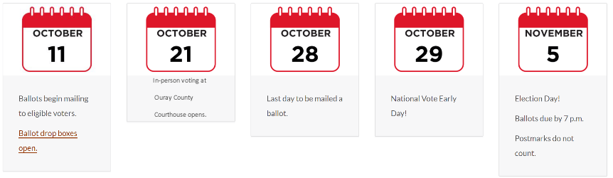 In-person voting at the Ouray County Courthouse opens October 21. If voting in-person, you must be in line before 7 p.m. on Election Day.